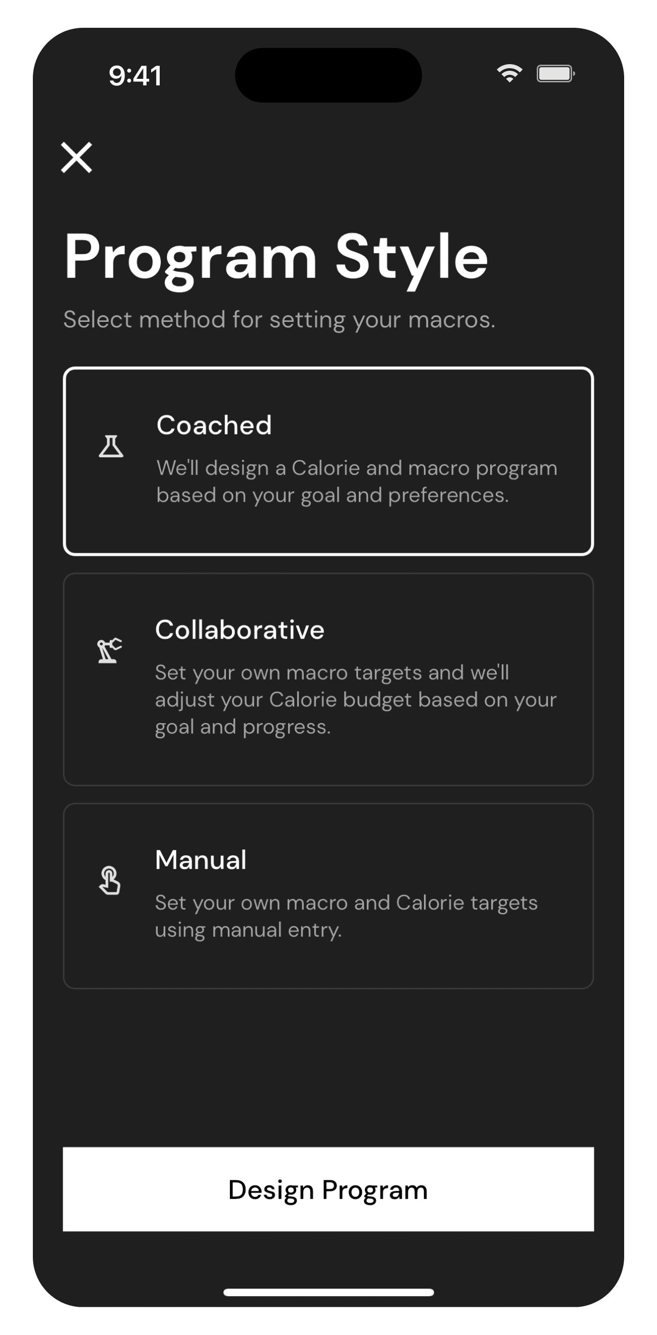 In the program design section, select the “balanced” option unless you have a specific dietary preference (e.g., low carb, keto, or low fat).